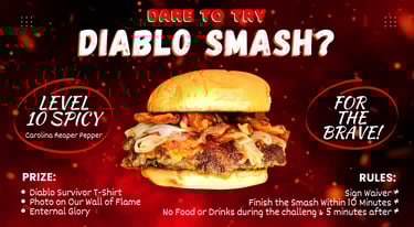 Welcome to the Hall of Flames! Here, we honor the fearless challengers who’ve conquered THE DIABLO CHALLENGE with Level 10 HEAT. Think you can handle the spice? Take the Diablo Challenge, record yourself eating the whole burger and send it to us, then you will earn your spot on the Hall of Flames.